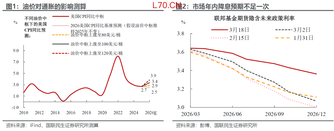 但近期伊朗相关地缘风险的升温,无疑为本就敏感的市场流动性环境“火上浇油”。油价的快速上涨直接加剧美国通胀反弹与经济增速放缓的双重风险,对美联储“控通胀、稳增长”的多重目标平衡构成严峻挑战,使得其政策容错空间持续收窄。市场预期也从此前的年内两次降息,一度下行至不足一次,且降息时点推迟至四季度,短期流动性环境受到明显影响。