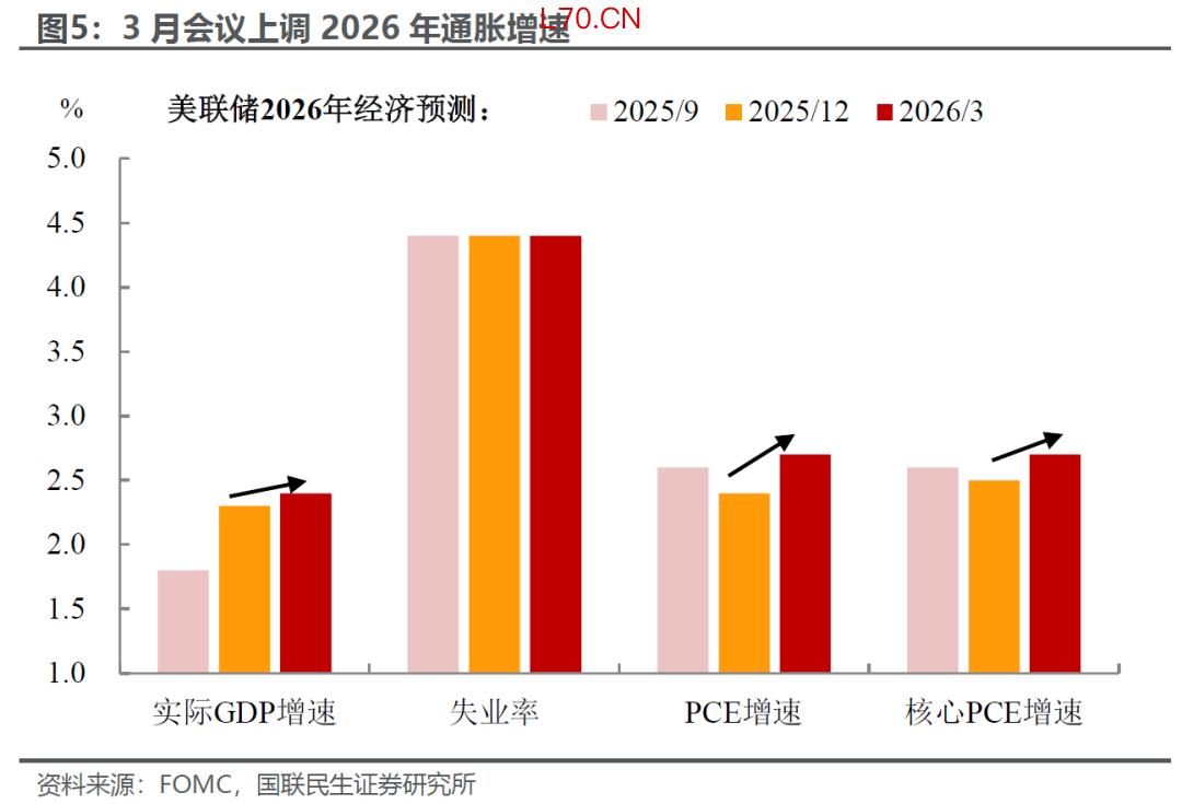 其三,经济预测同步上修2026年经济、通胀增速,PCE从前值的2.4%上修至2.7%,暗含了美联储对通胀中枢抬升的深层担忧。不过经济增速的小幅上调,意味着“滞胀”并不是当前联储对经济的基准预期。