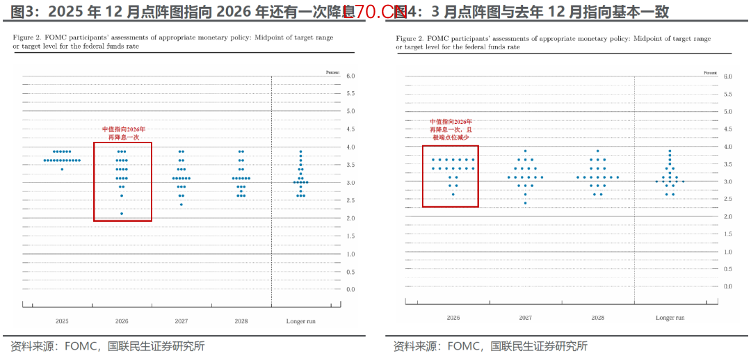 其二,点阵图基本维持去年12月的政策指引,即年内仍有一次降息,但更多投票者展现出鹰派倾向,3月会议也仅有米兰一人投出反对票,反映出美联储官员对通胀风险的重新定价。部分官员也开始讨论加息可能性,但并不在基本情景假设中。