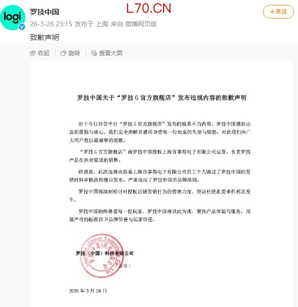 罗技中国就“罗技G官方旗舰店”违规内容致歉