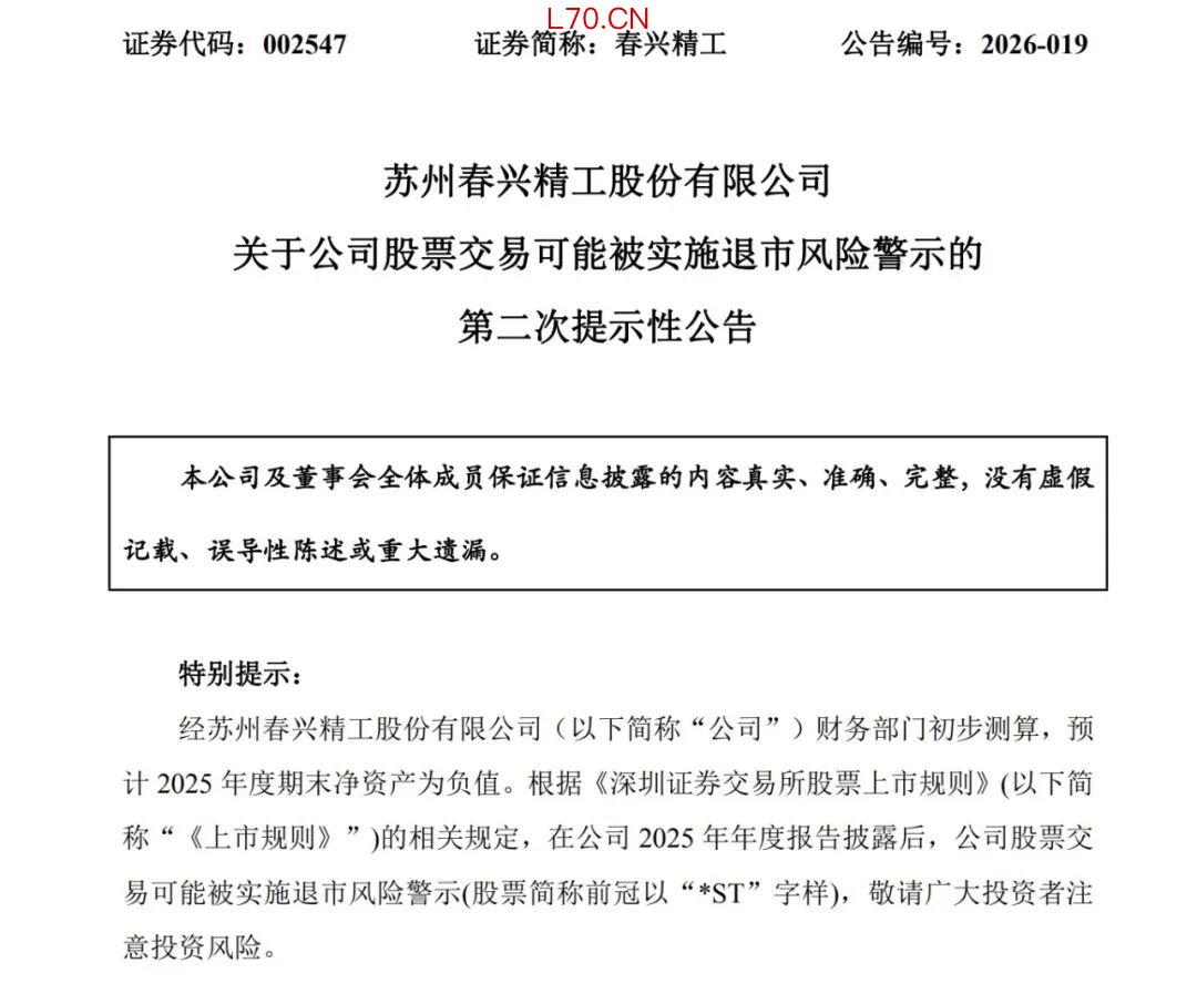 4月3日,春兴精工公告,经公司财务部门初步测算,预计2025年度期末净资产为负值。根据《深圳证券交易所股票上市规则》第9.3.1条第(二)项规定,上市公司出现最近一个会计年度经审计的期末净资产为负值情形的,深圳证券交易所将对其股票交易实施退市风险警示(股票简称前冠以“*ST”字样)。