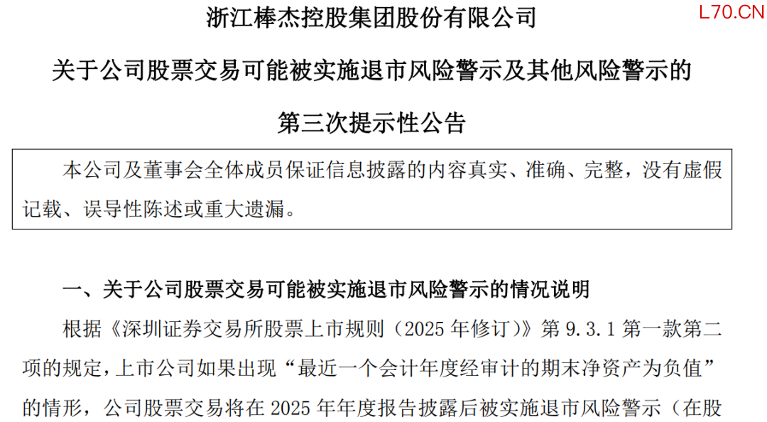 4月3日,棒杰股份公告,公司财务部门初步测算,预计2025年末归属于上市公司股东的净资产为-90,015.51万元至-60,015.51万元(未经审计)。根据《深圳证券交易所股票上市规则(2025年修订)》第9.3.1条第一款第二项规定,若公司2025年度经审计的期末净资产为负值,公司股票将在2025年年度报告披露后被实施退市风险警示(股票简称前冠以“*ST”字样)。