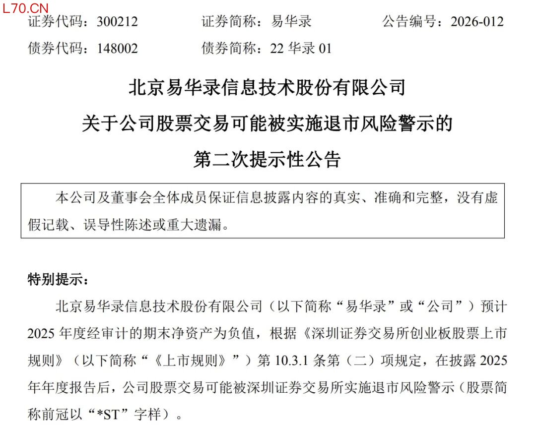 4月3日晚间,易华录发布预警,预计2025年度期末净资产为负值,公司股票交易可能被实施退市风险警示。
