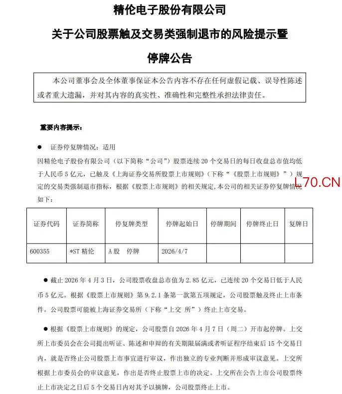 4月3日晚间,*ST精伦公告称,公司股票4月3日收盘总市值为2.85亿元,自3月9日至4月3日已连续20个交易日收盘总市值低于5亿元,已触及《股票上市规则》规定的交易类强制退市情形。同日,公司公告,收到上交所下发的终止上市监管工作函。