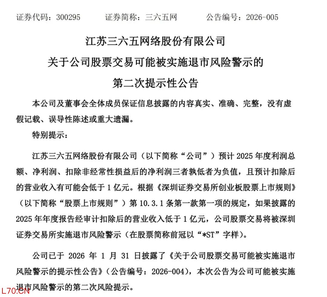 4月3日,三六五网亦发布公告称,预计2025年度营业收入可能低于1亿元,第二次就公司股票交易可能被实施退市风险发布警示。