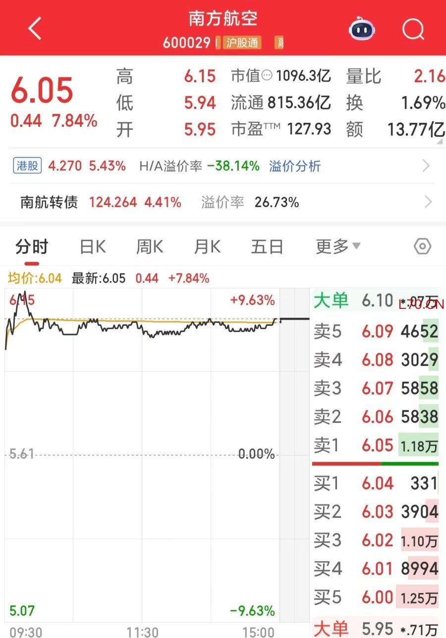 4月8日,南方航空开盘后股价立即冲高近涨停,收盘报6.05元,较前一交易日大涨7.84%,成交额达13.77亿元,总市值升至1096亿元。
