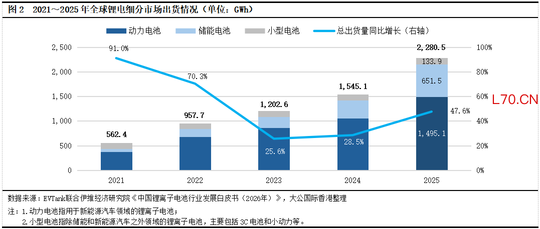 锂电池主要应用于新能源汽车动力电池、储能电池和3C产品的小型电池。2025年全球锂电出货量2,280.5GWh,同比增长47.6%,其中,动力电池出货量达1,495.1GWh,占比约65.6%,仍然是锂电的主要需求市场;储能电池出货量为651.5GWh,同比增速高达76.2%,是锂电市场的主要增量来源;小型电池主要包括3C电池和小动力等,2025年出货量为133.9GWh,占比约5.9%,虽占比小,但近年来AI、机器人等新兴技术正为其创造增量空间。