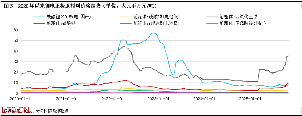 钴主要是铜钴矿和镍钴矿开采的副产品,主要用于电池制造、超级合金、磁性材料等。目前刚果(金)以铜钴矿为主,印尼则以镍钴矿为主。根据国际钴协会统计,2024年全球开采钴供应量达到25.4万吨,其中刚果(金)保持了76%的占比,而印尼占比则从2023年的8%提升至12%。钴材料受储量少、地域集中且存在较大地缘政治风险等因素影响,价格长期处于大幅波动状态。钴价在2020年处于低位,上游矿企投资意愿不足,产能扩张节奏缓慢,而这一阶段全球新能源汽车开始放量,钴的需求快速增长,供给端的增长速度难以跟上需求增速,为2021~2022年上半年的钴价上涨奠定了基础。2022~2024年,矿企产能集中释放,根据国际钴协会统计,2022~2024年,全球钴开采供应量分别为19.8万吨、23.2万吨及25.4万吨,同比增长分别为21%、17%和22%,而需求增速并未同步跟上,市场迅速转为供给过剩,钴价从高位持续下跌。2025年2月,作为全球近八成钴供应的刚果(金)宣布暂停钴出口四个月,后续又两次延期禁令,从10月起实施年度出口配额管理制度,2026年和2027年的年度出口配额则设定为9.66万吨,这一举措直接让全球钴供给“速冻”,供需关系阶段性逆转,受此影响,钴价触底反弹。