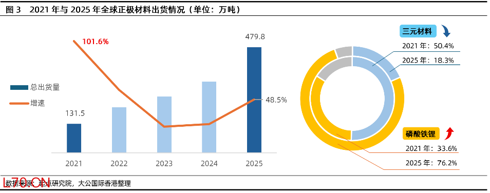 随着动力电池、储能电池等下游需求的旺盛增长,正极材料行业规模呈快速扩张态势,2021年总出货量为131.5万吨,到2025年已攀升至479.8万吨。然而,近年来增长节奏有所放缓,正极材料2021年曾达到101.6%的高增速,后续逐步回落至2024年的26.1%,2025年受益于储能市场爆发,增速提升至48.5%。在材料结构方面,市场占比出现明显变化,三元材料的份额从2021年的50.4%大幅收缩至2025年的18.3%;而磷酸铁锂则实现了占比的反超式增长,从2021年的三成左右,跃升至2025年的七成以上,成为当前正极材料的主流产品。与此同时,钴酸锂与锰酸锂的出货量相对平稳,在总出货量快速扩张的背景下,钴酸锂与锰酸锂的市场占有率持续弱化。这主要是由于近年来随着磷酸铁锂电池的研发创新,其能量密度已突破200Wh/kg,逐步接近中低镍三元材料水平,叠加其循环寿命长、成本可控的优势,在新能源汽车动力电池领域的渗透率持续提升,成为主流车企的核心选择。另外,储能市场需求激增推动磷酸铁锂快速扩容。相较于三元材料,磷酸铁锂在热稳定性、过充过放耐受性等安全性能上更具优势,且不含镍、钴等贵金属,成本优势显著,成为储能电池的首选正极材料。