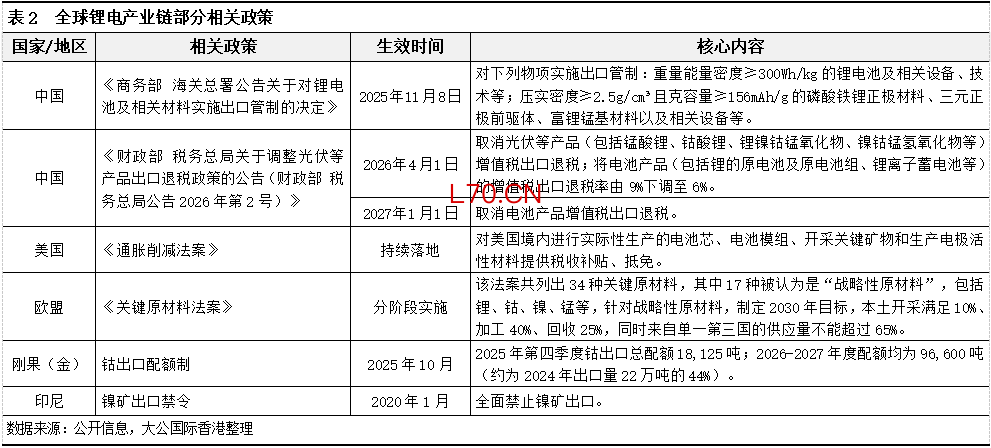 面对行业规模迅速扩张伴随的产能过剩、低价竞争等问题,中国正在掀起“反内卷”的治理浪潮,以维护其锂电相关行业在全球的领先地位。2024年7月,针对新兴产业和未来产业,中国中央政治局会议首次提出强化行业自律,防止“内卷式”恶性竞争;2025年8月,中国化学与物理电源行业协会发布《关于维护磷酸铁锂材料行业健康有序发展的倡议(征求意见稿)》(以下简称“倡议”),湖南裕能、湖北万润、德方纳米等9家行业内企业参与倡议,共同抵制恶性价格竞争,合理定价,倡议提出企业当年产能利用率低于70%时,应主动暂缓新增产能,并淘汰落后产能,行业整体产能利用率低于60%时,全行业暂缓扩产,聚焦技术升级,并推动建立高标准行业准入门槛,加速低效产能出清,优化产业结构。2025年11月,中国对高性能锂电及材料进行出口管制;2026年初,中国财政部、税务总局发布出口退税政策,从2026年4月1日起,取消锰酸锂、钴酸锂、锂镍钴锰氧化物、镍钴锰氢氧化物等的出口退税,并将电池产品的增值税出口退税率由9%下调至6%;从2027年1月1日起,取消电池产品增值税出口退税。中国正极材料行业自律与多项政策措施正引导行业从“政策扶持导向”转向“市场竞争导向”,倒逼企业提升技术与产品附加价值,加速落后产能出清,预期将进一步推升市场集中度。我们认为这些措施有助于行业可持续健康发展,但短期波动仍需密切关注。