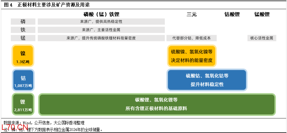 生产正极材料主要需要的矿产资源包括磷、铁、锰、镍、钴、锂等。其中,磷、铁、锰资源相对丰富,但磷酸铁锂的生产高度依赖磷资源,因此不少磷酸铁锂生产企业都有磷矿的布局,包括湖南裕能、湖北万润等;部分面向磷酸锰铁锂路线的企业亦配套布局锰矿,而铁矿因整体供应充裕,企业多以长协采购为主,直接布局矿权较少。相比之下,镍、钴、锂等金属资源,全球储量相对有限,资源分布集中且价格波动剧烈,是各大正极材料厂商(尤其是三元正极材料厂商)近年来争相部署的重要上游资源,例如,邦普循环布局了刚果(金)钴矿资源、印尼红土镍矿、玻利维亚锂盐湖;华友钴业拥有刚果(金)铜钴矿采矿权、并于2022年收购津巴布韦锂矿;德方纳米在四川阿坝布局开拓锂矿资源等。