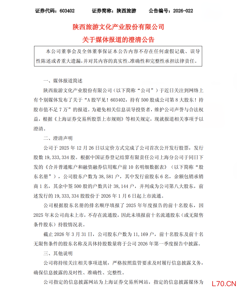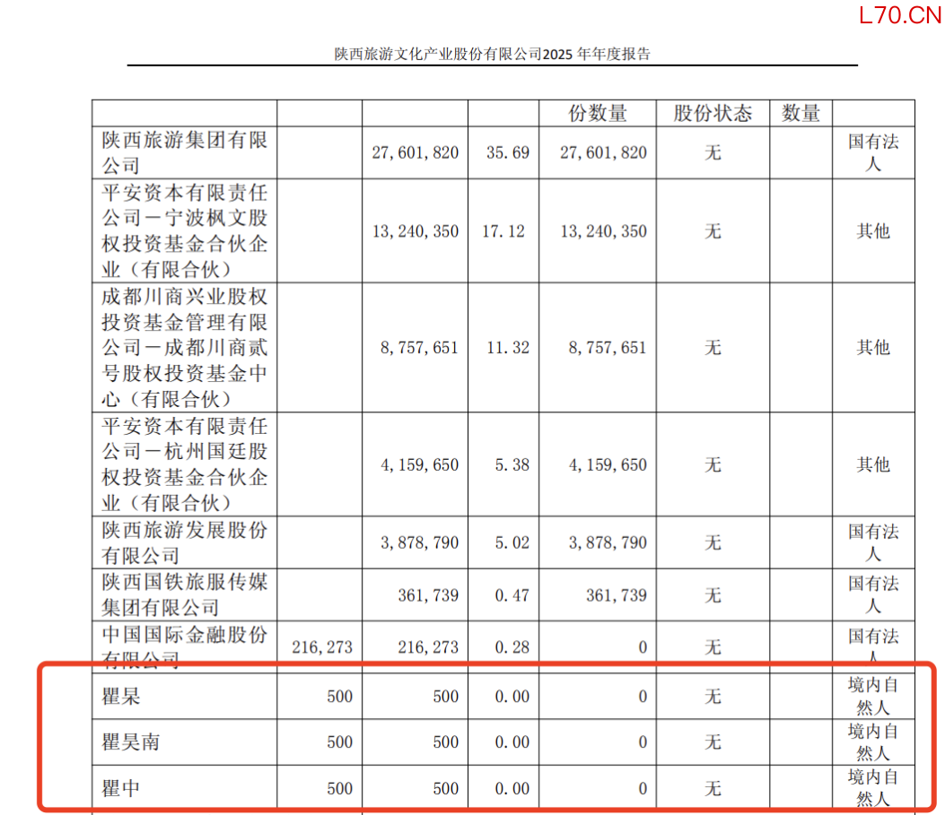 日前,陕西旅游发布2025年全年财报,公司前十大股东中出现了多名持股仅500股的自然人股东,消息引发市场关注。