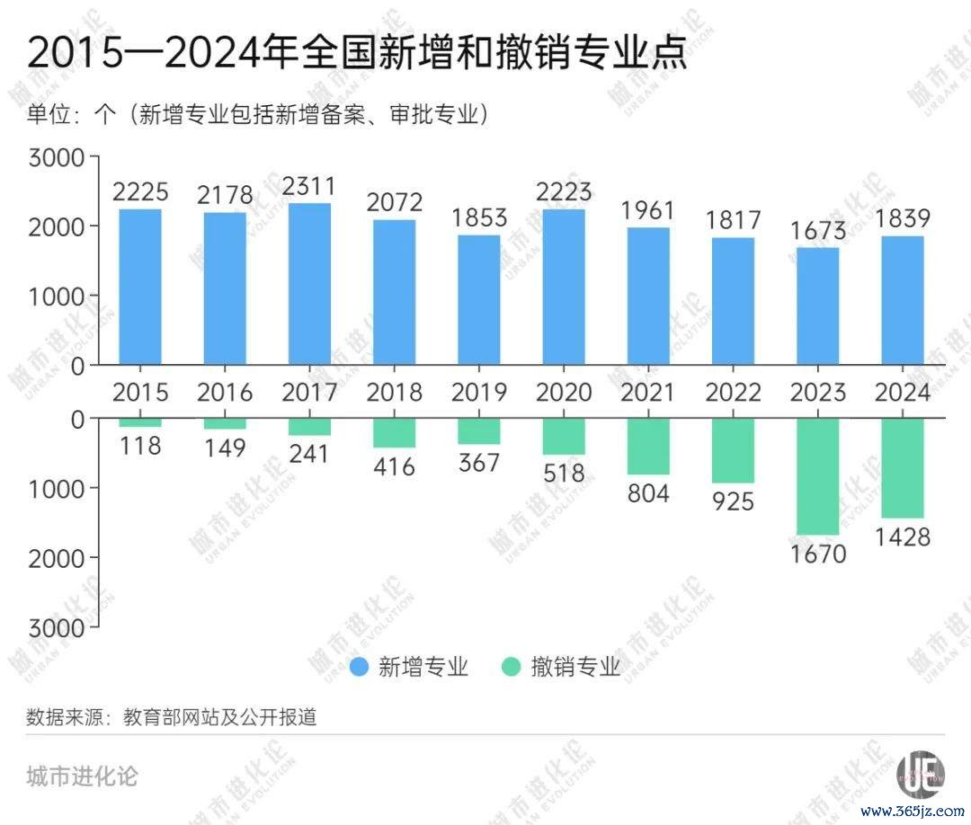 近两年,全国高校专业调整力度持续加大。数据显示,过去十年,我国共撤销6636个高校本科专业点,其中仅2023年、2024年撤销数量就达到3098个,占过去十年撤销数量的一半左右。