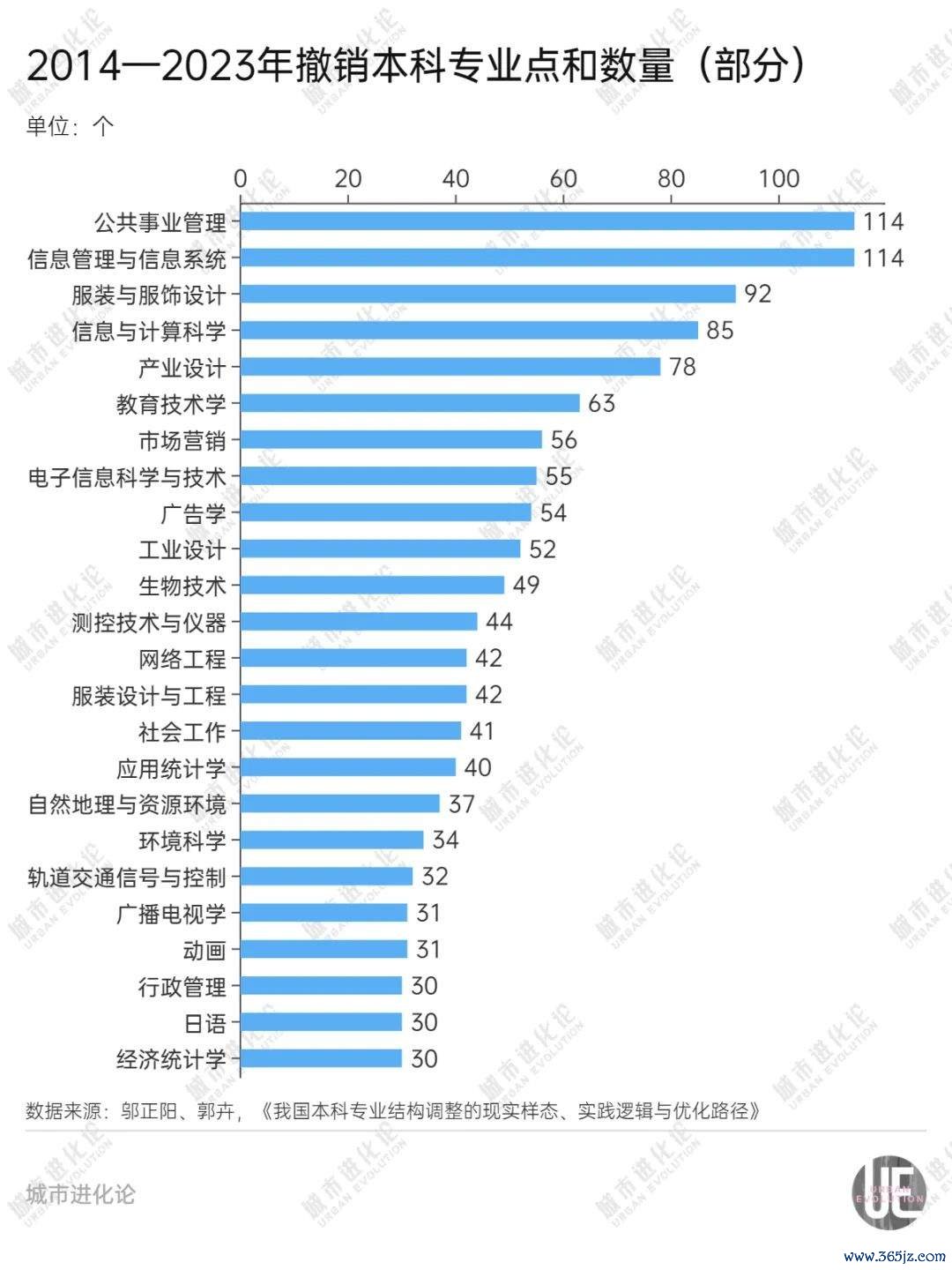 另据《我国本科专业结构调整的现实样态、实践逻辑与优化路径》一文披露,2014—2023年,公共事业管理、信息管理与信息系统、服装与服饰设计、信息与计算科学、产品设计、教育技术学、市场营销、电子信息科学与技术、广告学、工业设计等本科专业点撤销最多,数量均在50个以上。