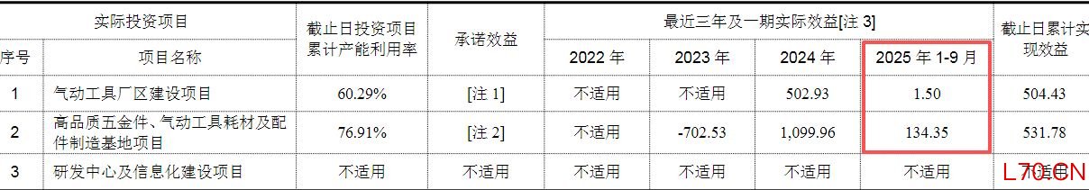 具体来看,2024年,气动工具项目和制造基地项目的实际效益分别为502.93万元和1099.96万元。2025年前三季度,这两个项目的实际效益皆大幅减少,气动工具项目实际效益仅有1.50万元,制造基地项目实际效益为134.35万元。