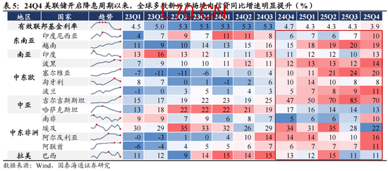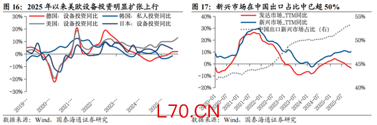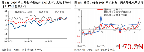 具备全球竞争优势的制造业出海。在通胀整体回落与美联储降息的背景下,全球制造业景气度与投资增速边际改善,除AI投资继续扩张之外,全球基础设备建设与制造业产业转移也在进一步加速。2026年1月,全球制造业PMI加速改善,为2024年6月以来的最高水平,结构上,印度、东盟、美国和日本均呈现强劲增长。对利率环境最敏感的新兴经济体当前国内信贷普遍高速增长,25Q4东南亚、中东欧等国家国内信贷增速继续高位抬升。发达国家方面,美国、欧洲设备投资增速在2025年持续提升。我们认为,在全球央行降息周期与各国国内积极的产业政策推动下,全球制造业的新一轮产业转移与复苏趋势正愈发清晰,典型的外向型经济体如韩国、越南1-2月出口高频数据高位抬升。这意味着中国具备国际竞争优势的产业出海仍然是2026年最具确定性的增长趋势之一。继续推荐机械、电力设备、商用车等。