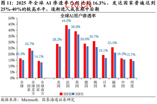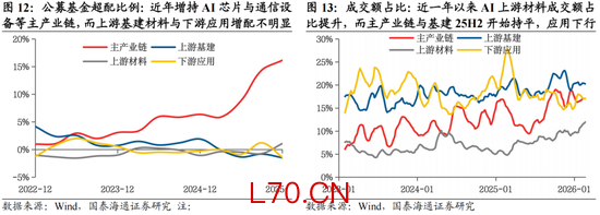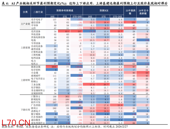 AI进入成长期后期,投资机会从主产业链向上游设备材料与下游应用扩散。从产业渗透率来看,AI产业自GPT时刻以来已历经3年有余,25H2全球AI用户渗透率已达到16.3%,其中发达国家普遍达到25%-40%的产业渗透率水平。从产业生命周期视角看,AI产业生命周期已经走出导入期朦胧创新,并走过成长期早期的产业标准化扩张,逐渐进入成长期的中后期。我们认为,当前AI产业投资的特征与其他渗透率达到相似阶段的科技浪潮并无显著不同,一方面,AI主产业链的迭代速度放缓,大模型能力边际提升减弱,产业投资规模也从前期的超前投资与上修规模逐渐转向量入为出、注重投资回报,主产业链预期上修的斜率放缓;另一方面,AI产业链专业化分工程度加深,前沿应用、零部件领域仍在展开突破性创新,产业规模的持续扩张也带动了广泛的“泛AI”投资,包括上游设备基建与相关有色、化工新材料。从当前A股AI产业链的盈利、市场与成交占比来看,近三年机构主要增持的是TMT硬件相关的主产业链股票,电子行业的超配比例已经接近19年食品饮料、超过21年电力设备。而从成交占比与股价表现看,主产业链股票与25Q4后开始滞涨,而上游材料、设备等股价与成交占比出现提升。因此我们认为,下阶段AI投资的重点会从中游TMT设备的主产业链向上下游扩散:1)上游零部件与材料投资:AI新技术路径、新材料如NPO/CPO、TPU、覆铜板(CCL)、电子布、小金属如钨、钼、镓等;2)AI基础设施与设备:包括能源、电网、储能与机房相关设备,如核电与燃气轮机、电力传输与配电设备、储能设备、热管理设备系统等;3)AI下游应用生态:应用场景丰富的头部互联网大厂。