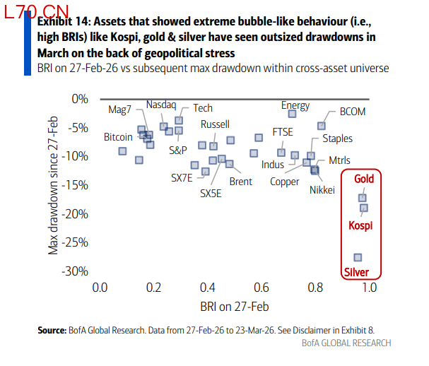 报告举例称,韩国股市、黄金、白银等此前具备“泡沫特征”的资产,在地缘冲击中出现更大幅回撤。逻辑很简单:当资金不是基于基本面,而是基于趋势时,一旦趋势反转,价格下跌会更剧烈。