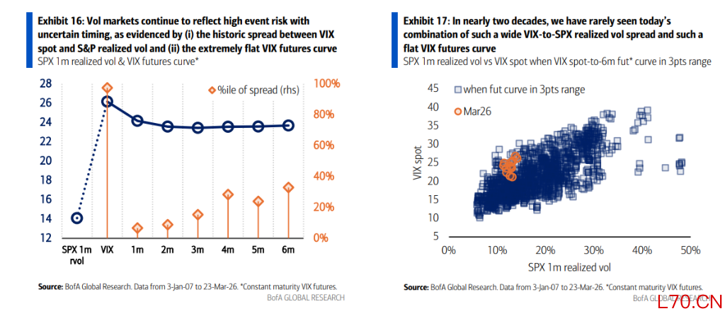 目前波动率市场提供了一个最清晰的信号:不确定性正被极致定价。报告显示,一个惊人的现象是,VIX现货和期货水平远高于标普500的实际波动率(20+ vs 10+),且VIX期货曲线在如此高的波动水平下表现得异常平坦。